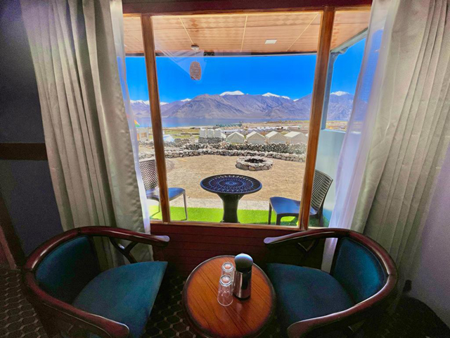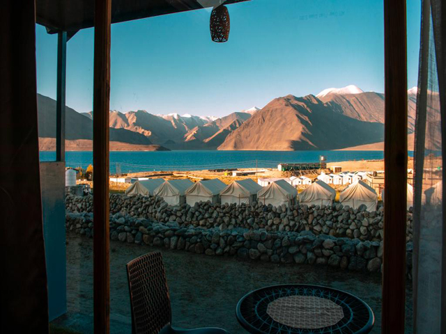 Indulge in premium comfort with panoramic views of the pristine Pangong Lake.